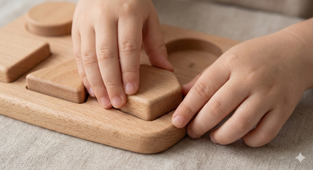 Child engaged in deep play with YUCI wooden toys, giving mom peace of mind, popular in USA.