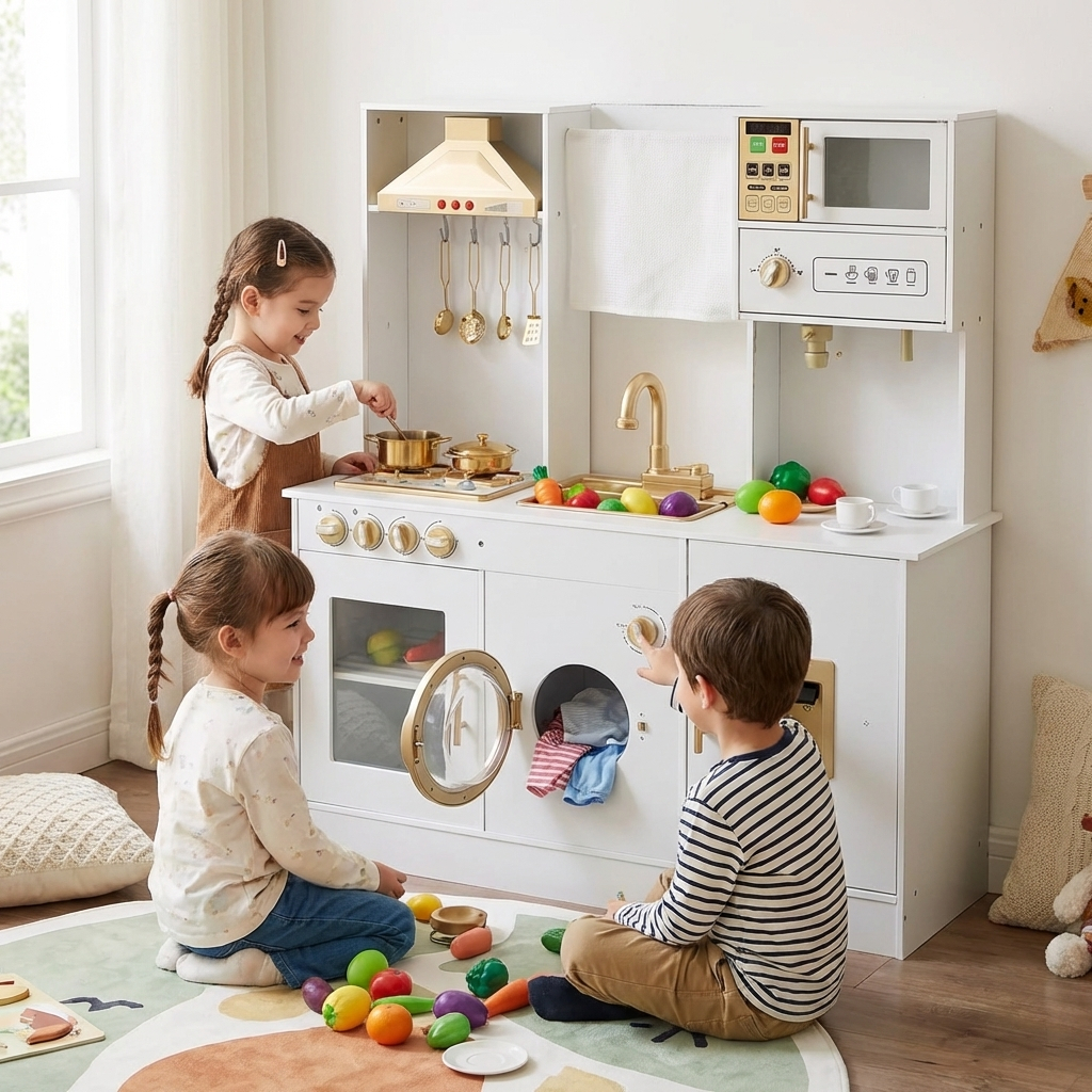 Children love to mimic adults. A wooden kids kitchen is the ultimate "practical life" toy in Montessori philosophy. It encourages role-play, vocabulary building, and cooperation.